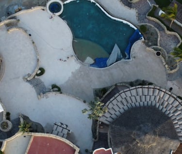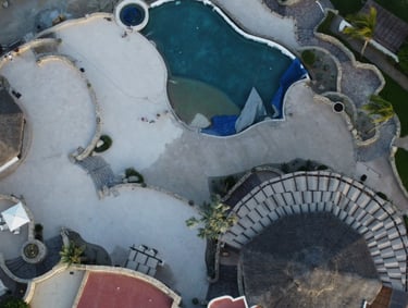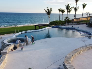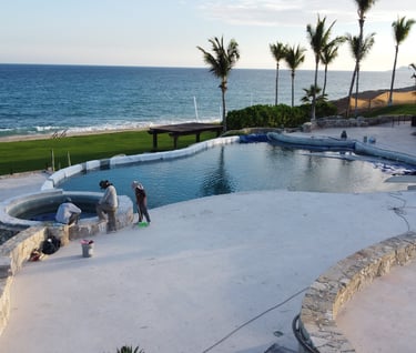 The newly designed swimming pool area will be spacious and feature updated finishes, equipped with modern furniture including lounging zones, shaded areas, and an infinity-edge pool that seamlessly integrates with the coastal landscape.